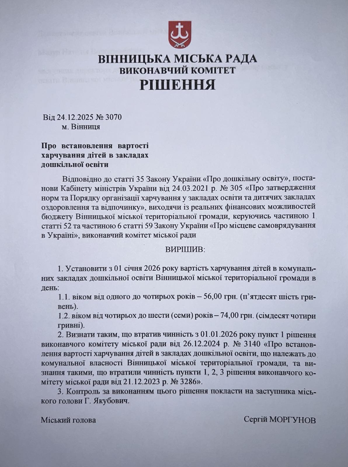 Розмір плати для батьків за харчування дітей в закладі