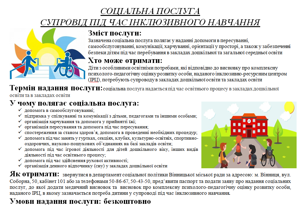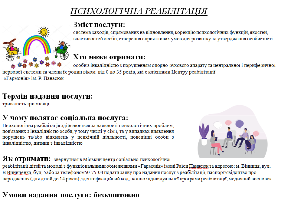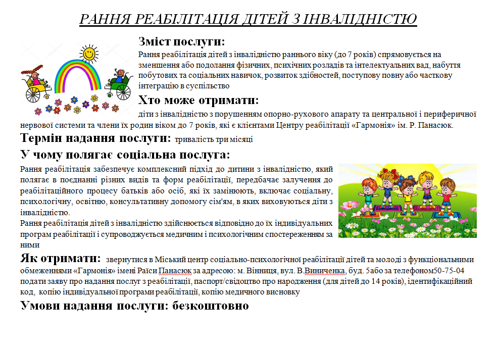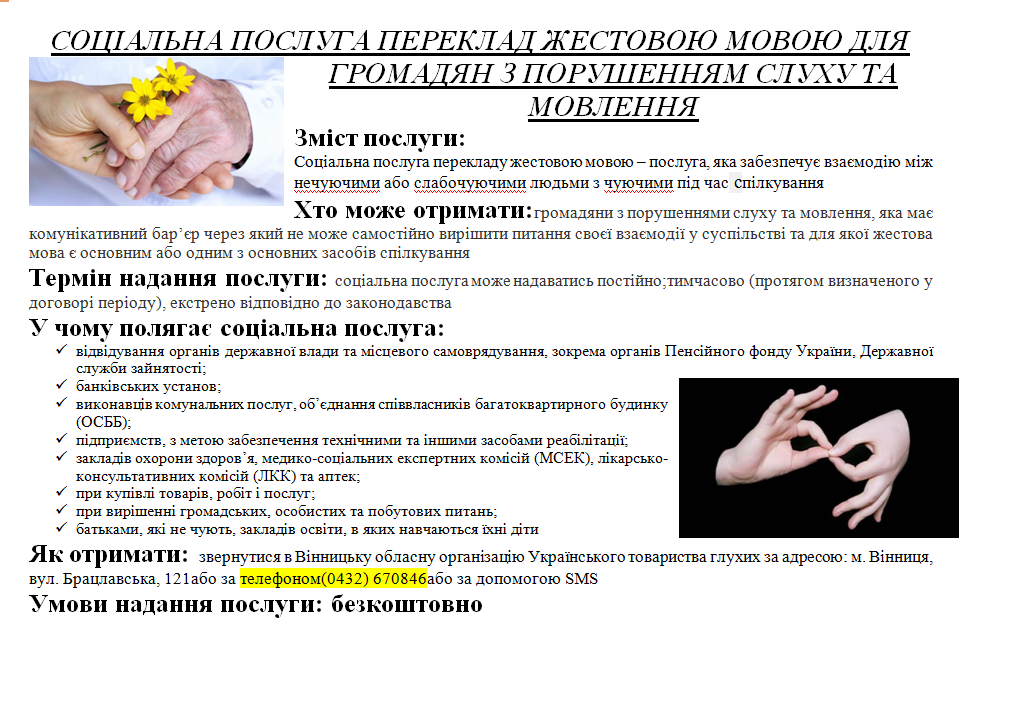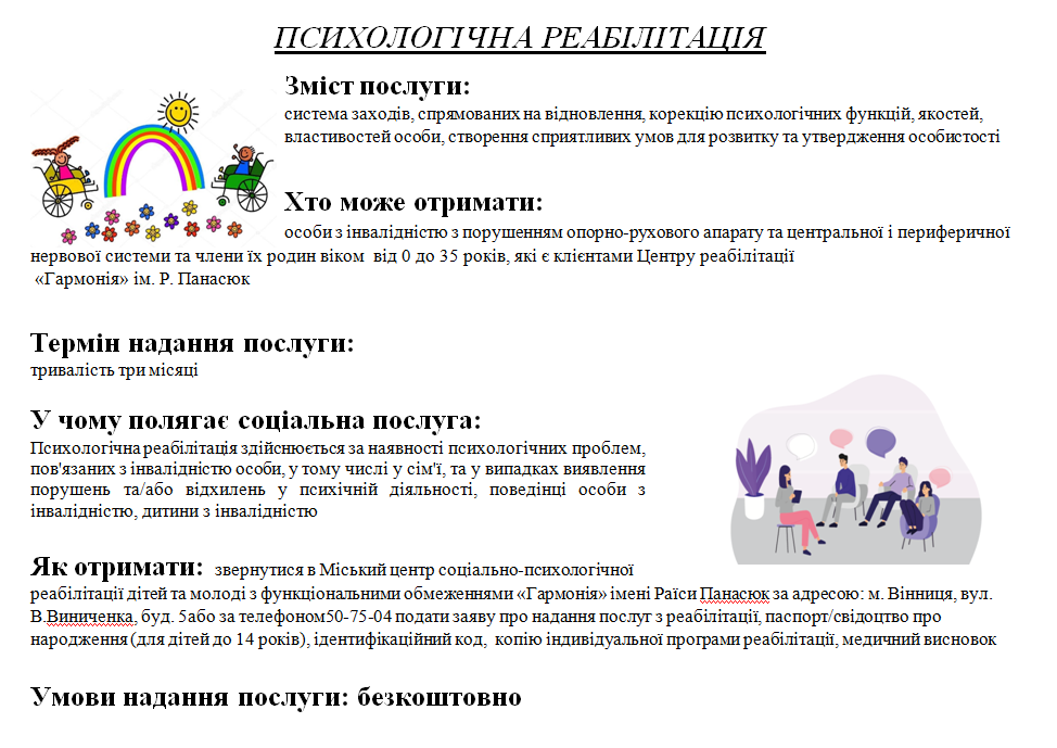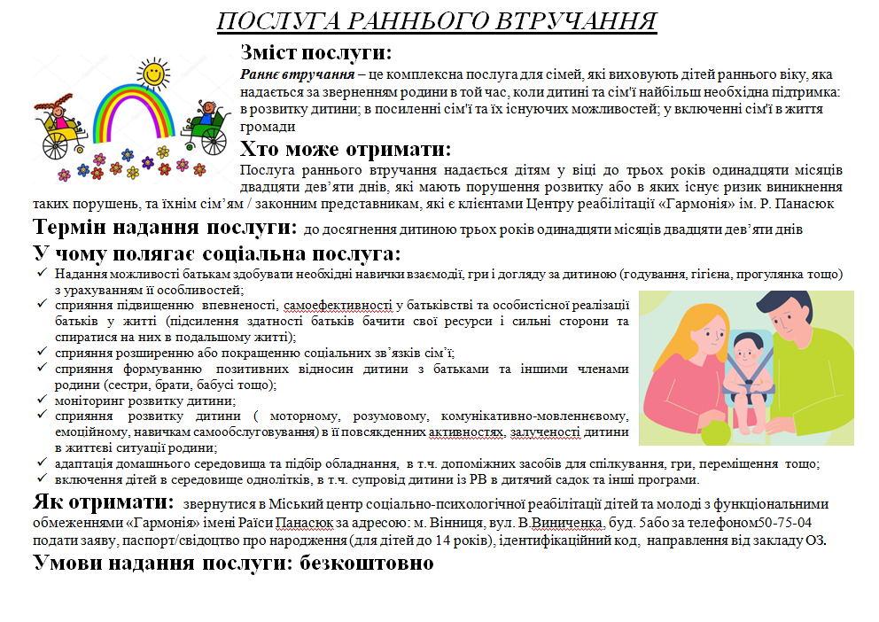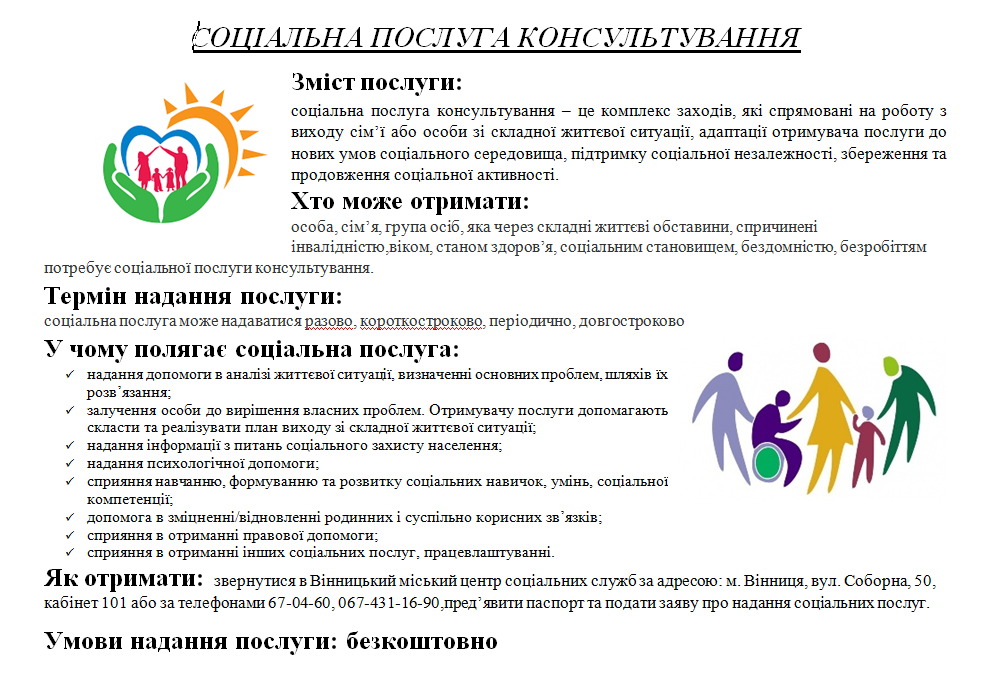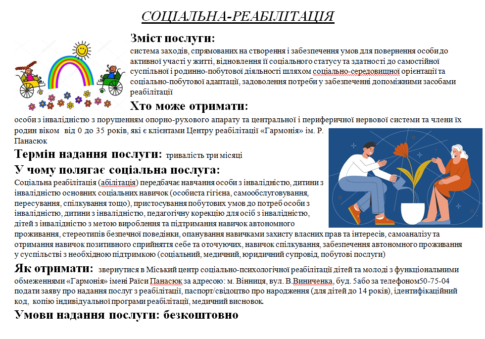Перелік соціальних послуг, їх зміст і порядок, які надаються дітям та дорослим нашої громади Вінницьким міським центром соціальних служб, КЗ «Міський центр соціально-психологічної реабілітації дітей та молоді з функціональними обмеженнями «Гармонія» імені Раїси Панасюк» та громадськими організаціями, які є надавачами соціальних послуг: