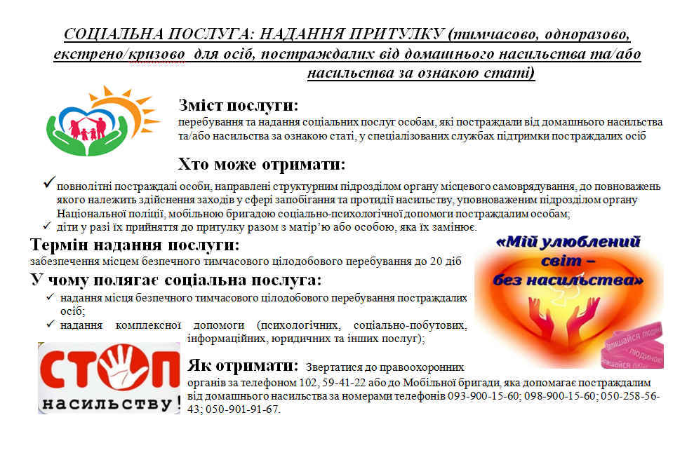 - надання притулку (тимчасово, одноразово, екстрено/кризово для осіб, постраждалих від домашнього насильства та/або насильства за ознакою статі);