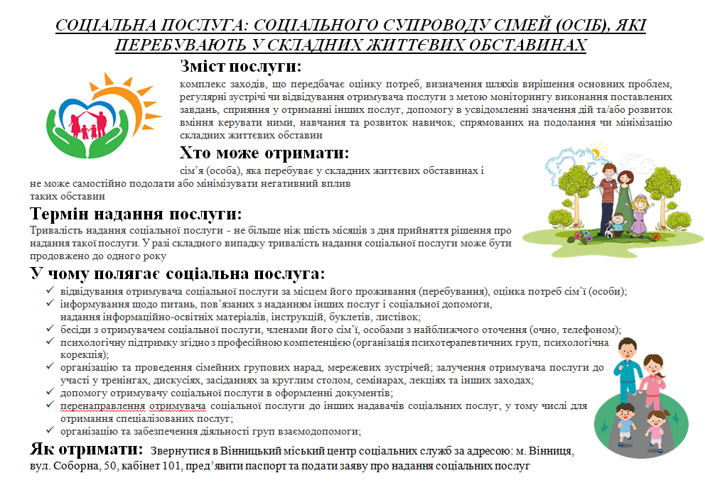 - соціальний супровід осіб/сімей, що перебувають у складних життєвих обставинах;